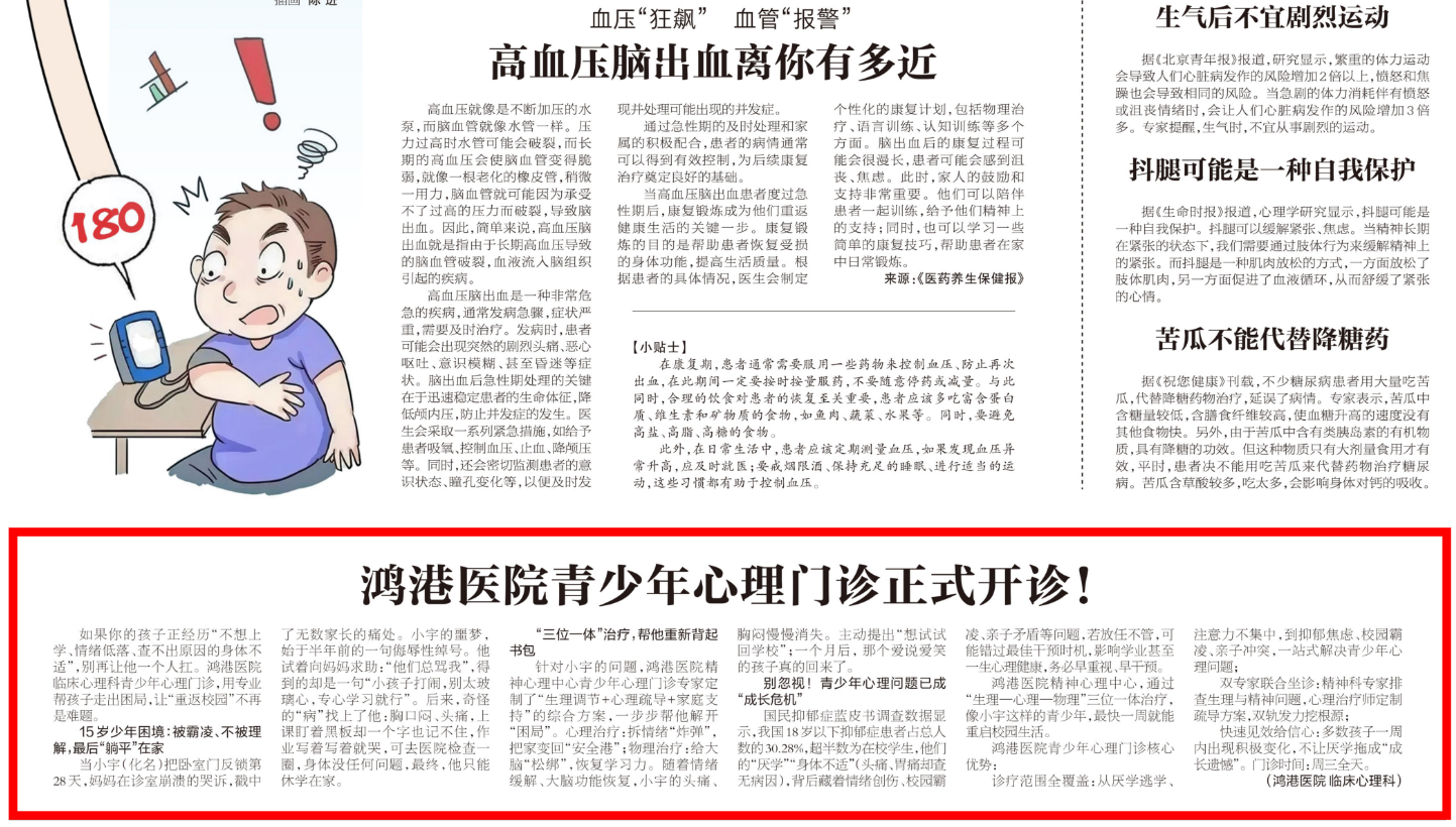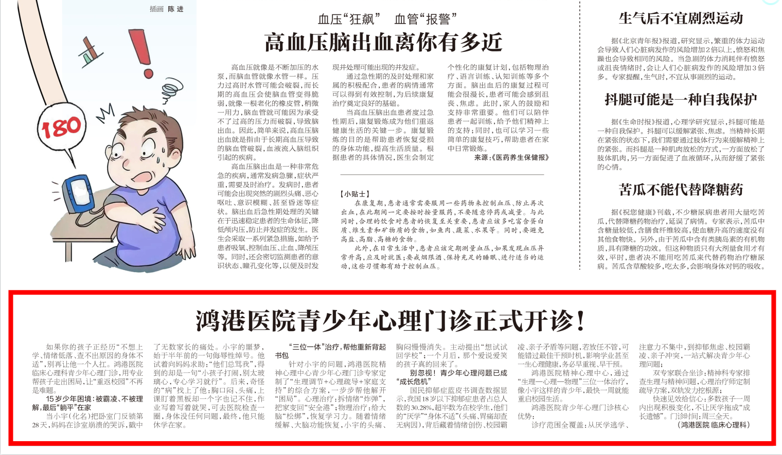 胜利日报《新生活周刊》见报:鸿港医院青少年心理门诊正式开诊!
