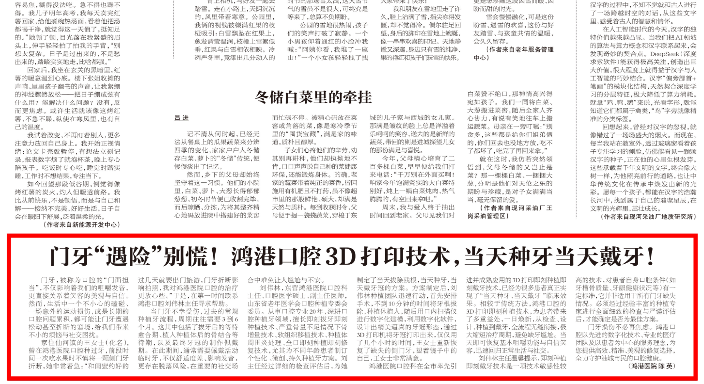 胜利日报《新生活周刊》见报:门牙“遇险”别慌!鸿港口腔3D打印技术,当天种牙当天戴牙!