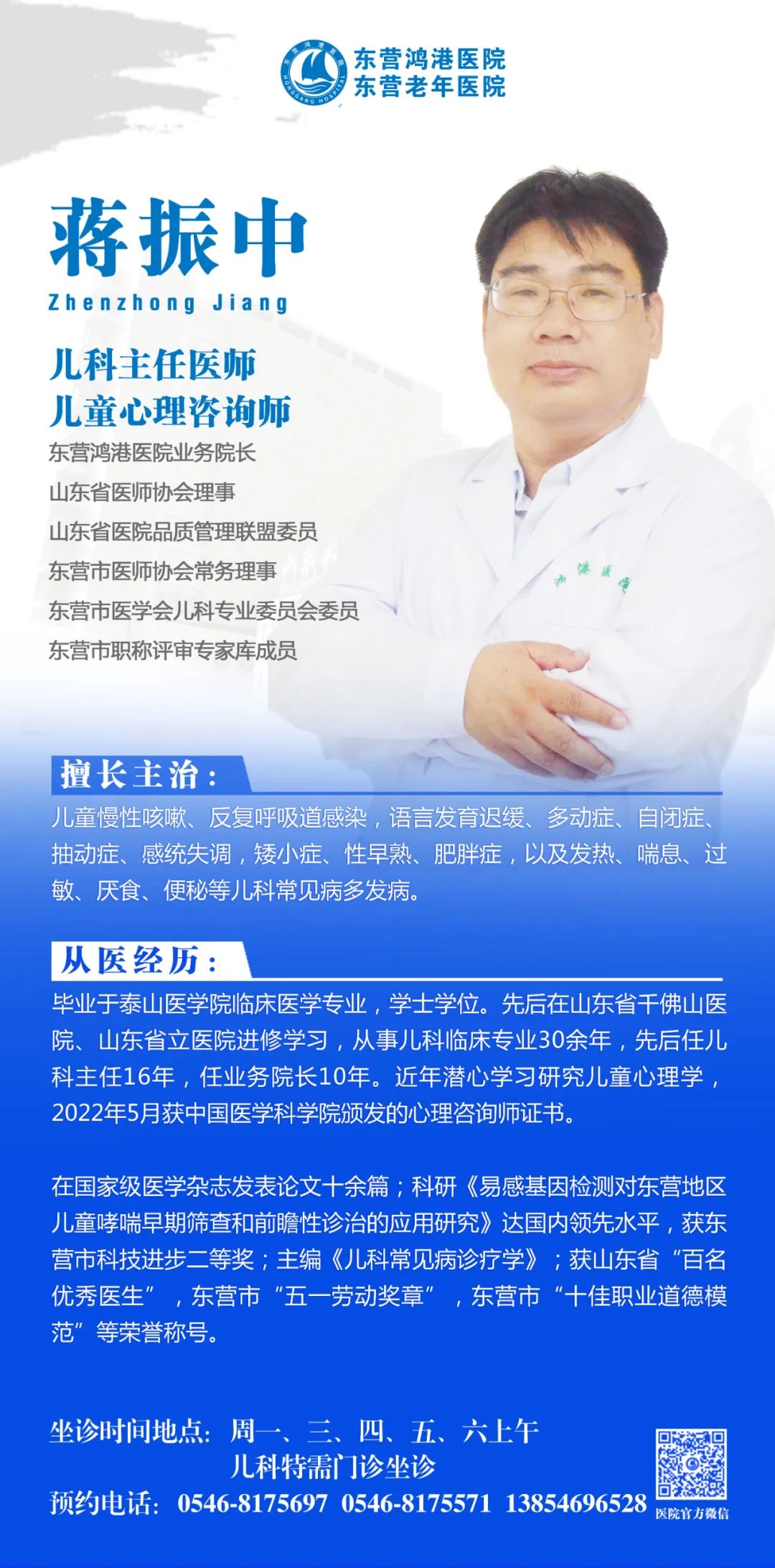 多年来,东营鸿港医院一直致力于儿童青少年生长发育防治,并设有儿童特色专科生长发育门诊。形成了主任医师1名,副主任医师2名的生长发育主诊团队,在儿童身材矮小、性早熟、肥胖症等疾病的诊治方面积累了丰富的经验。