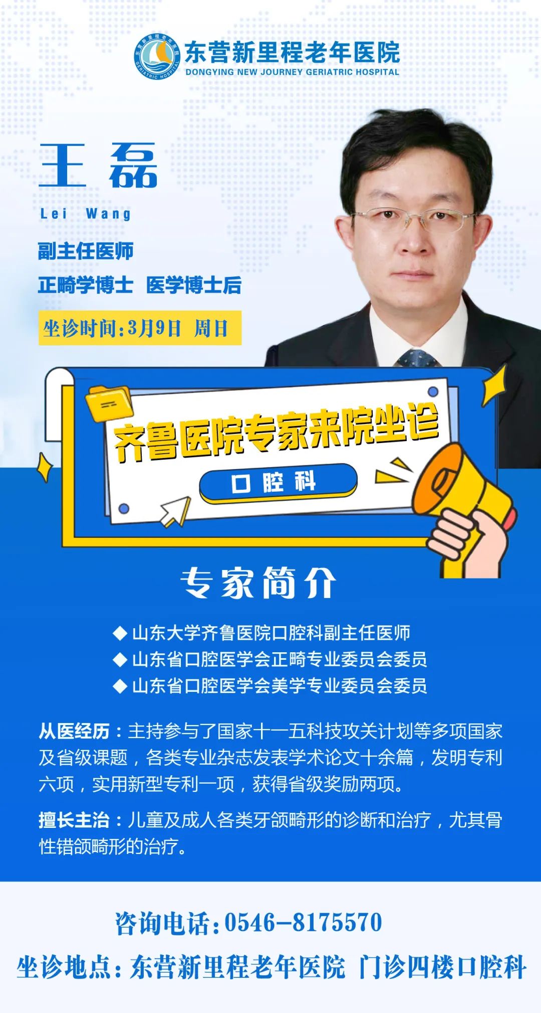 3月9日,山东大学齐鲁医院口腔科正畸专家王磊博士全天在东营新里程老年医院(原东营鸿港医院)坐诊。
