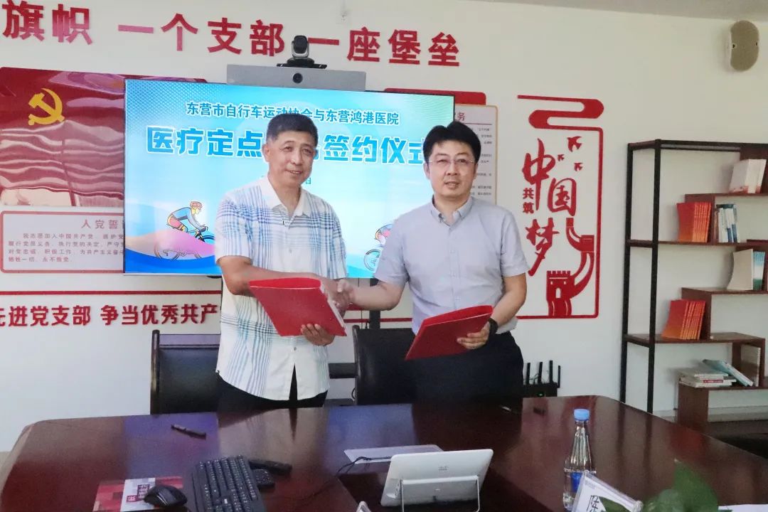 为保障自行车骑行爱好者人身安全,及时应对自行车赛事、骑游活动等自行车项目发生的意外突发事件,使伤者能得到迅速、及时和有效的治疗和康复。6月4日,东营鸿港医院与东营市自行车运动协会签订医疗定点服务协议,为市自行车运动协会的广大爱好者提供专业的医疗保障。市自行车运动协会会长殷树军、副会长、支部书记魏知连,东营鸿港医院院长陈建邦、书记刘长光,双方相关部门负责人参加了签约仪式。